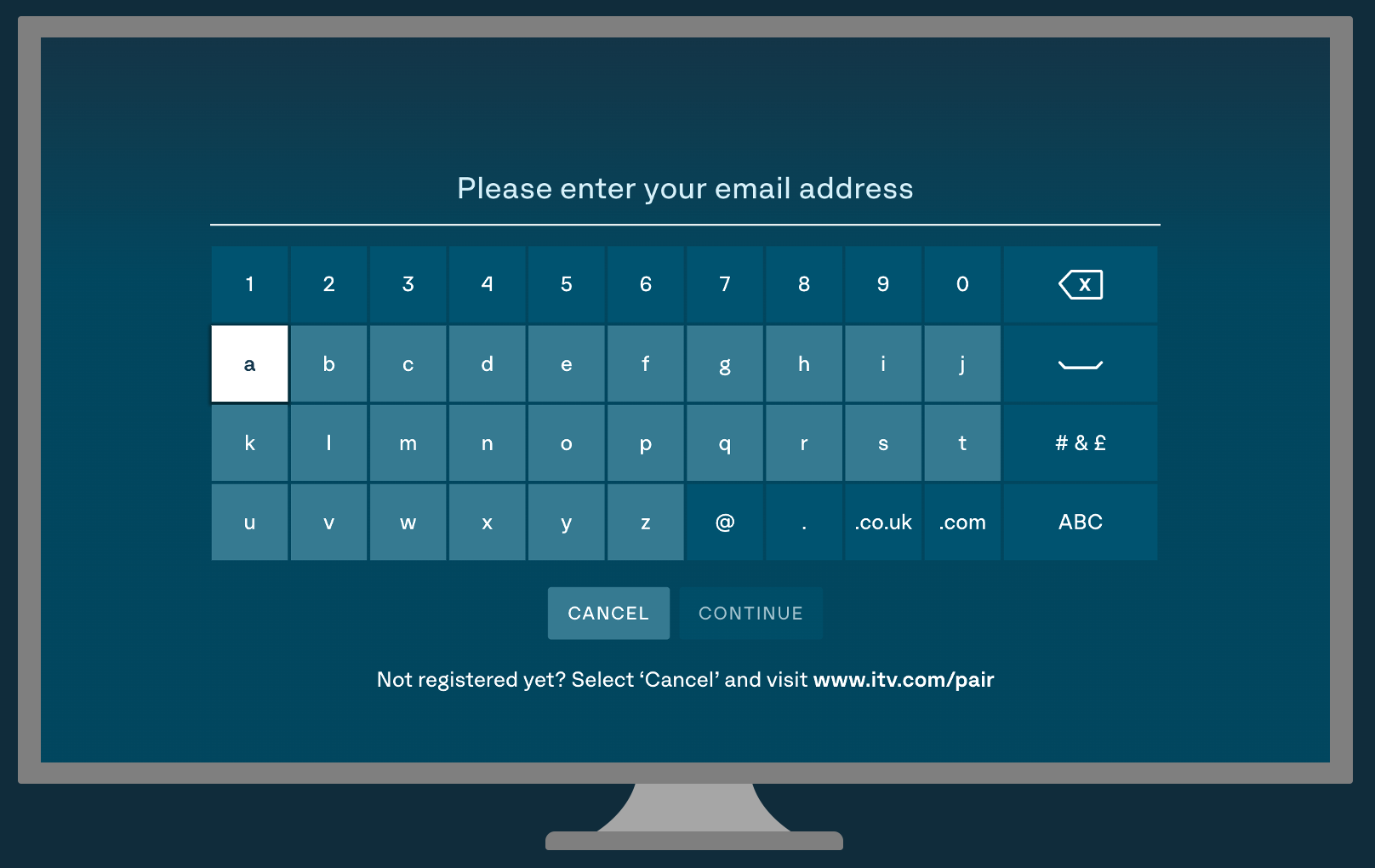 2. Use the keyboard with your remote's directional keys to enter your email address. Then click Continue.